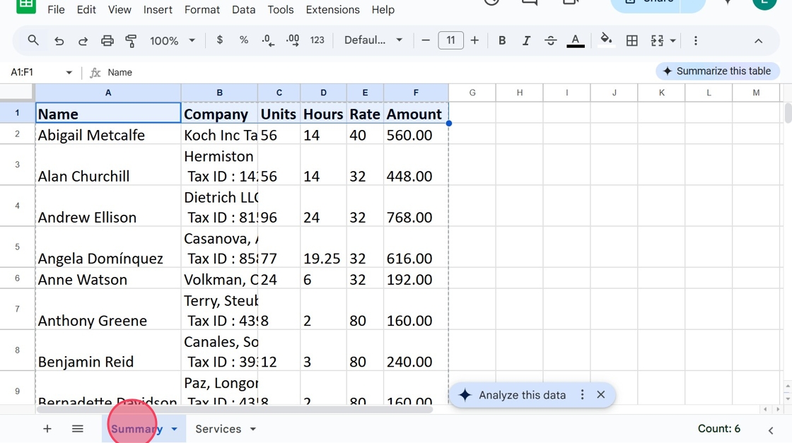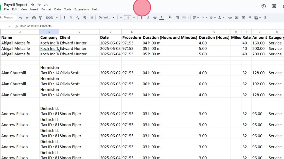23. Esta hoja contiene una pestaña de detalles con un desglose de cada instancia de servicio incluida en el Payroll.