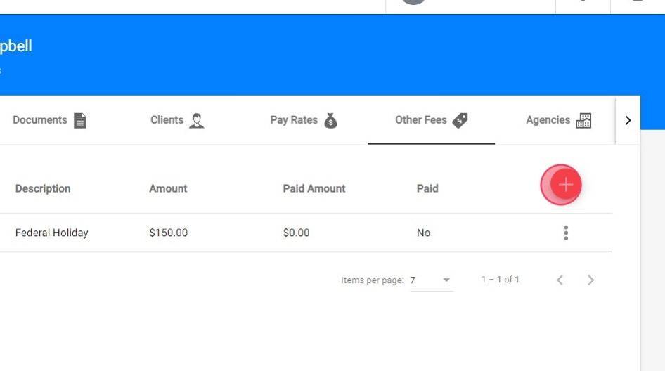 Haga clic en el símbolo de suma rojo para crear una nueva entrada de fee.