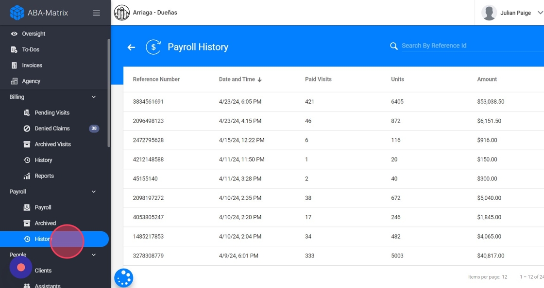 2. A new window will open with the records of all the payrolls that have been run in the agency, but you can only reverse the last payroll. Locate the payroll and direct your attention to the three vertical dots to the right: