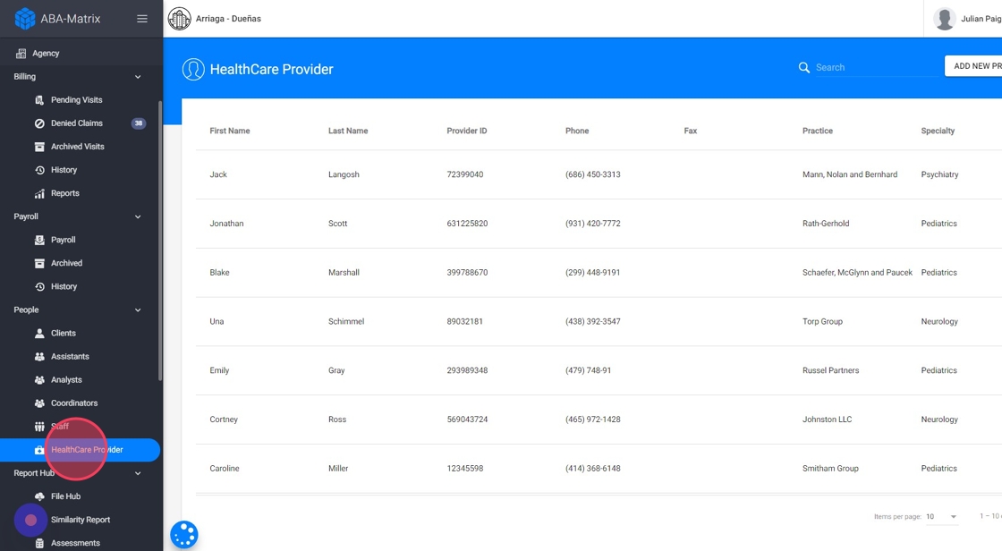 2. Luego, desde la pantalla de "HealthCare Provider", haz clic en el botón "Add new Provider" ubicado en la esquina superior derecha, como se muestra en la imagen: