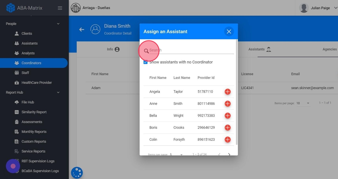 10. By default we only show RBTs with no coordinator, but you can unmark the checkbox Show assistants with no Coordinator and you will see all the RBTs from the agency.