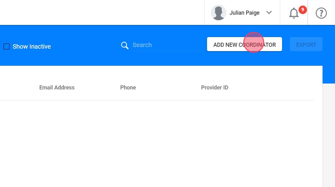 2. After opening the "coordinator" tab, press the "Add new coordinator" button, located in the upper right part of the screen, as shown in the image.