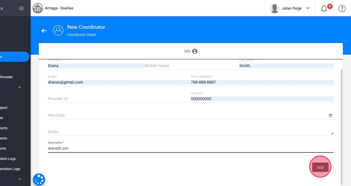 5. After all the fields are completed, the “Add” button, located at the bottom right, is pressed to complete the introduction of a new coordinator to the system. It is seen in the image.