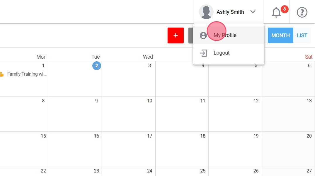 2. Una vez que entre al programa irá directamente el calendario. Diríjase a la parte superior derecha de la pantalla donde podrá ver una opción identificada con su nombre de usuario (username). Como se muestra en la imagen.