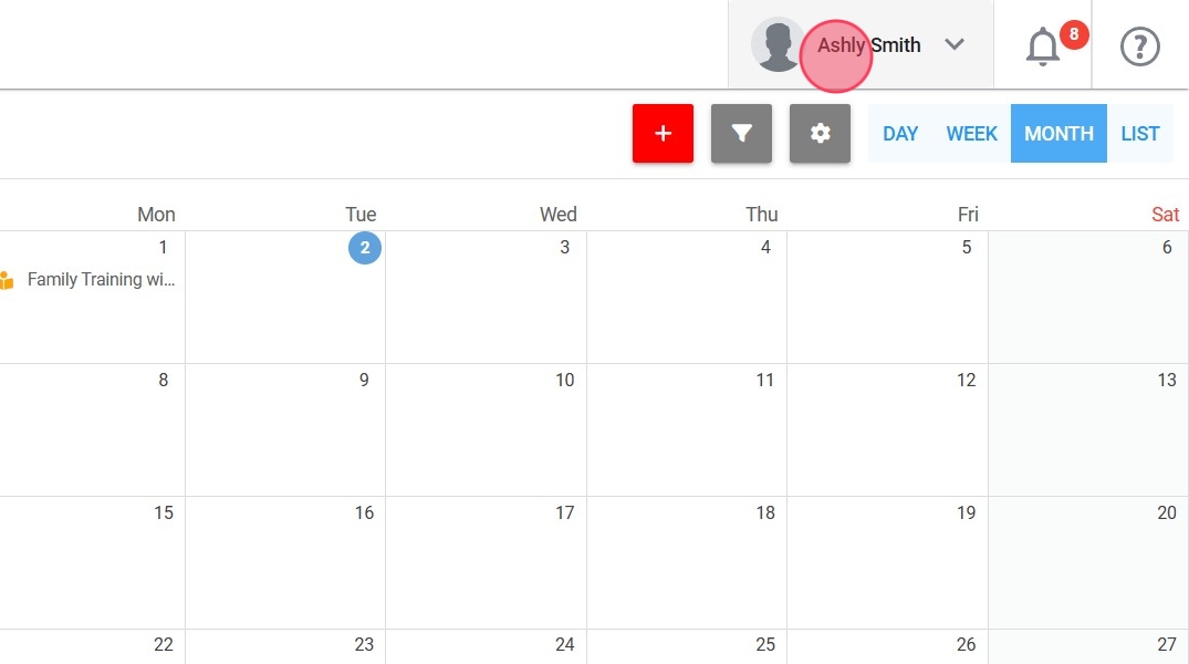 2. Upon entering the program, you will be taken straight to the calendar. Navigate to the upper right corner of the screen, where you will find an option labeled with your username, as illustrated in the picture.