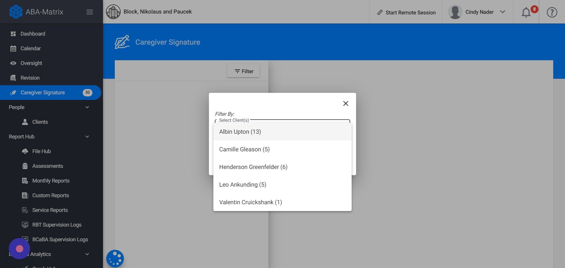 3. A new window will open in which you must select the client to filter the work sessions to be signed by the caregiver. Then click "Apply Filter".