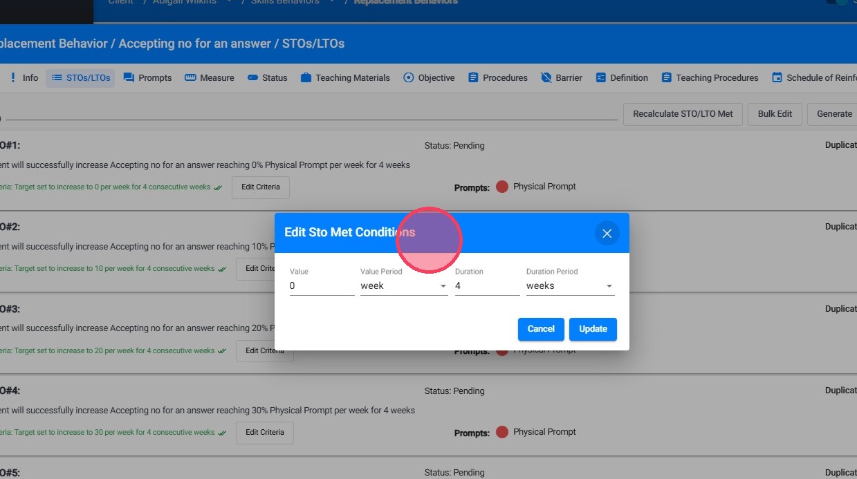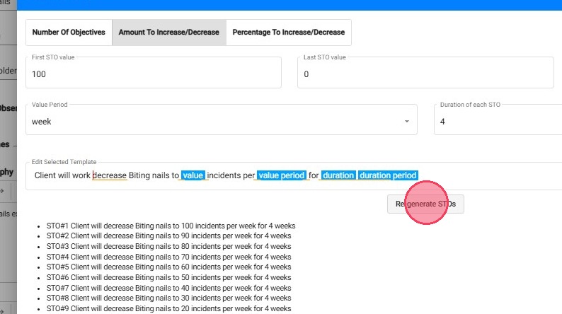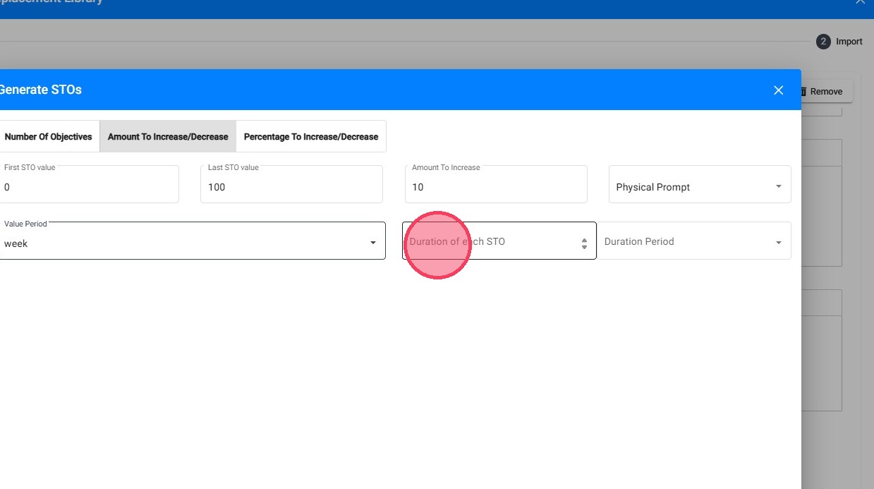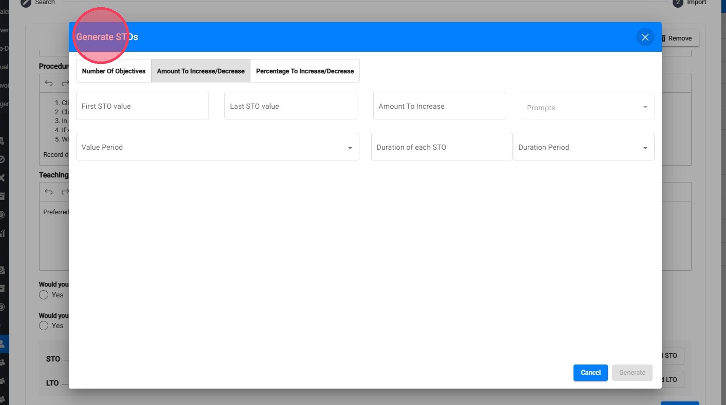 4. Al seleccionar la opción Generate STOs, aparecerá una ventana emergente que le permitirá configurar y generar automáticamente los Objetivos a Corto Plazo (STOs).