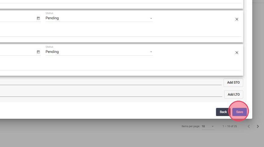 23. - Al utilizar la opción Add STOs, puede crearlos manualmente. Cada STO se agrega de forma individual y, después de ingresar y revisar sus detalles, debe guardar cada uno por separado para finalizarlo.