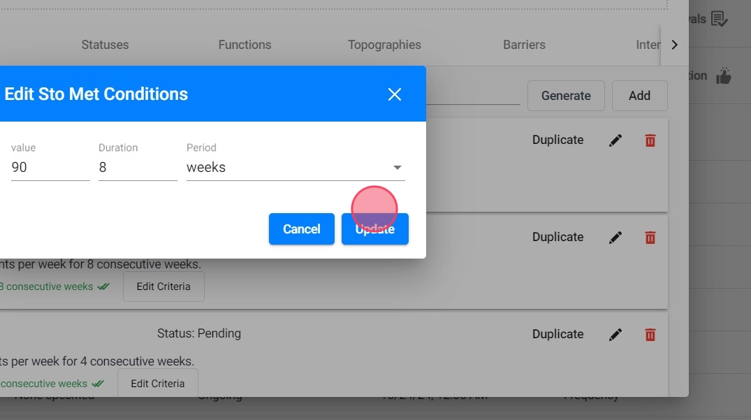 Each time a visit is submitted, the system checks if the STO meets the "met" conditions, based on the defined criteria (value, duration and period).