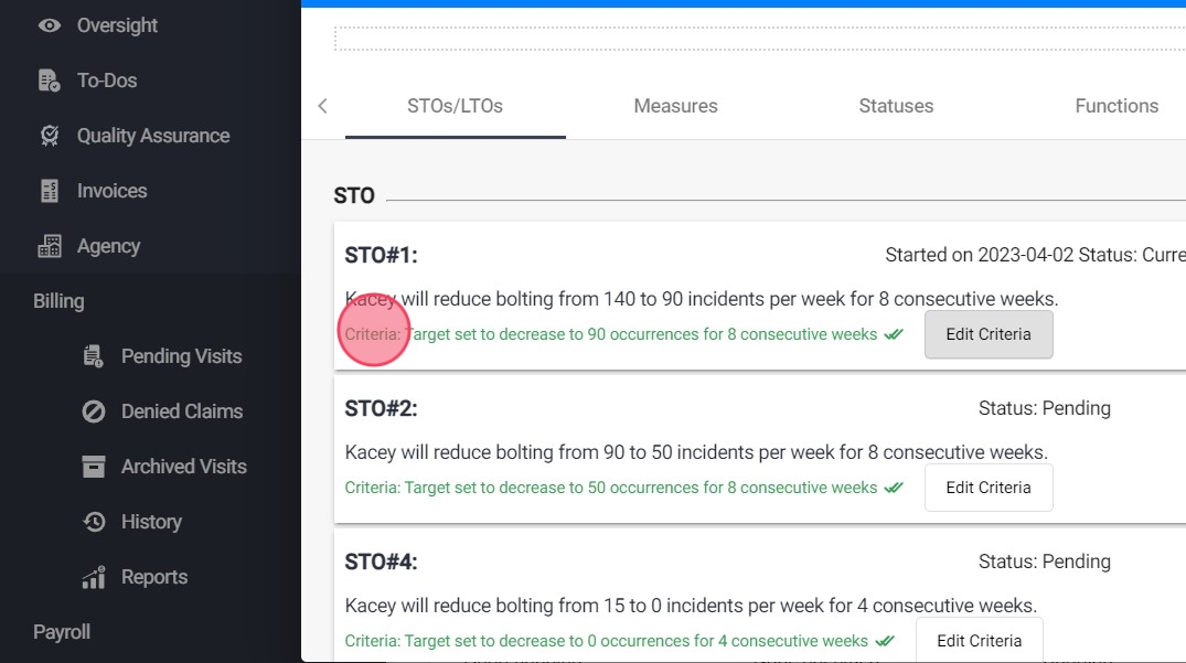 If your agency has enabled the setting to automatically mark STOs as met, the system will mark the STO as "met" with the determined date and proceed to the next STO.