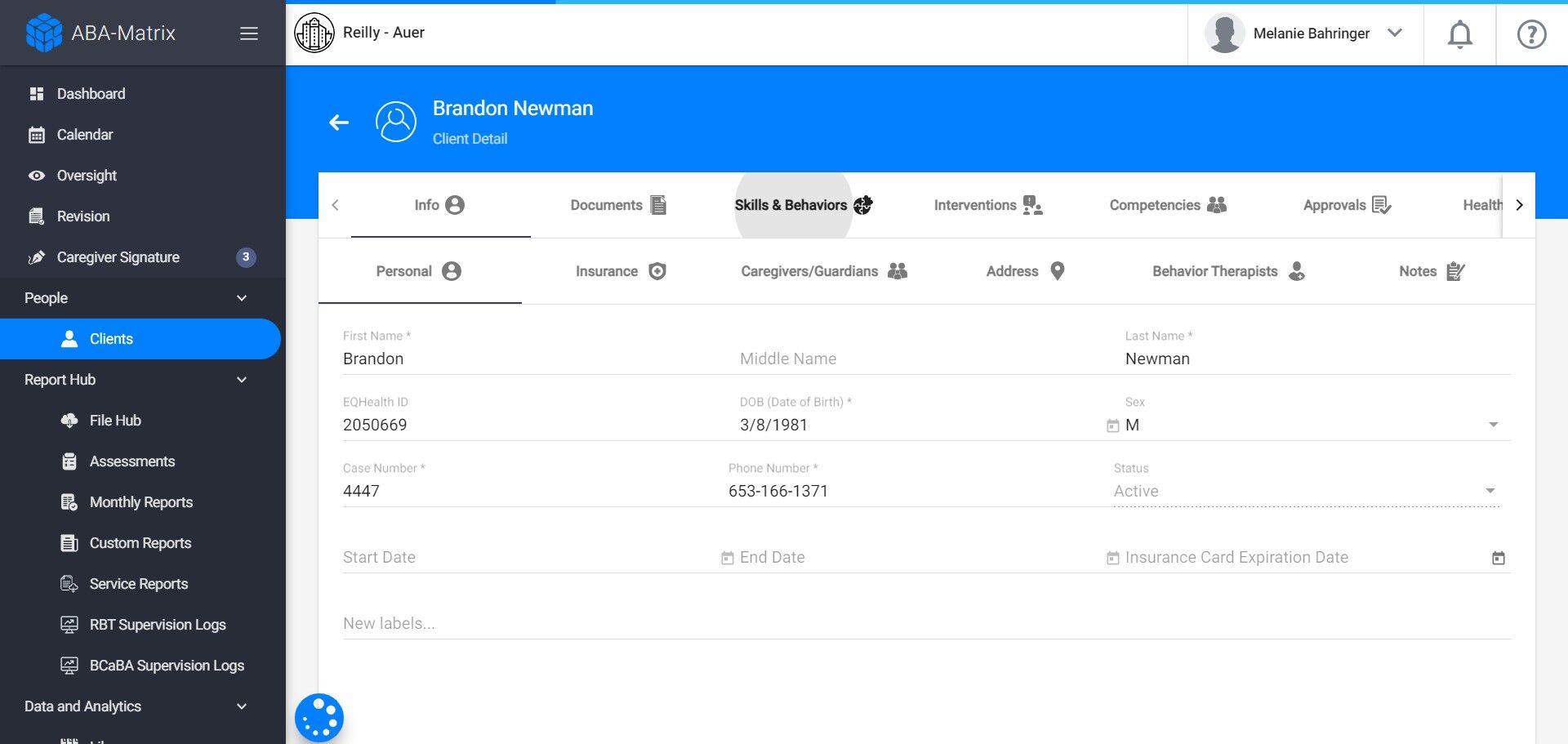- A screen displaying all the documentation and client information will appear. Navigate to the menu bar at the top of the screen and choose the "Skills & Behaviors" tab.
