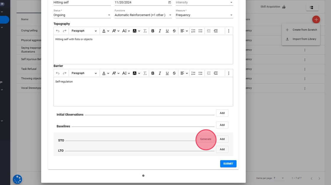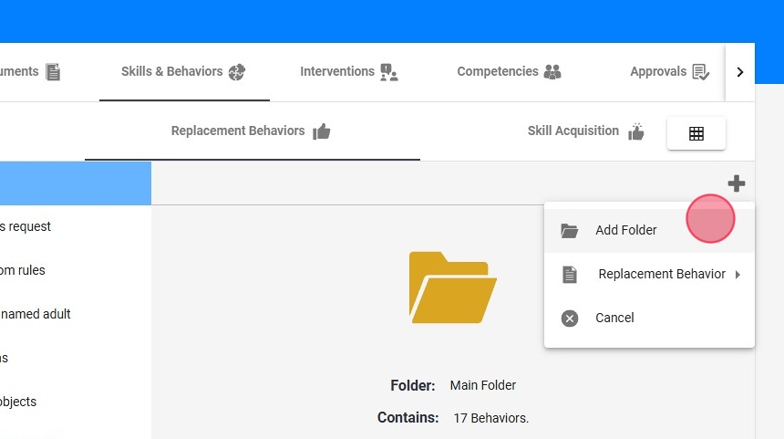 Los usuarios tienen la opción de crear Comportamientos Maladaptativos, Comportamientos de Reemplazo o Programas de Adquisición de Habilidades desde cero.