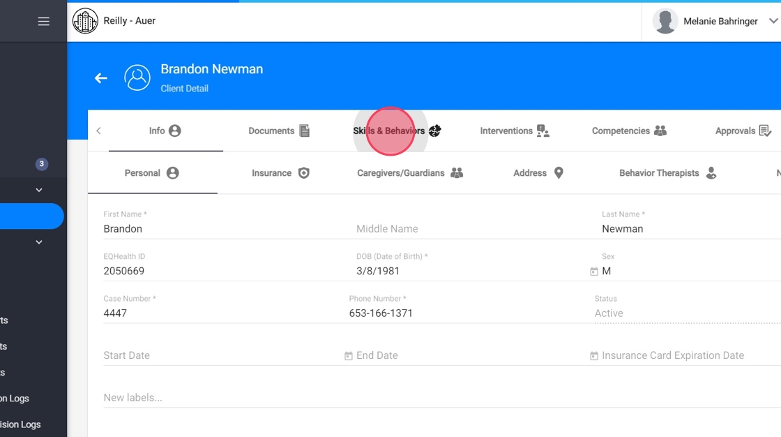 - Aparecerá una pantalla con toda la documentación e información del cliente. Navegue a la barra de menú en la parte superior de la pantalla y seleccione la pestaña "Skills & Behaviors".