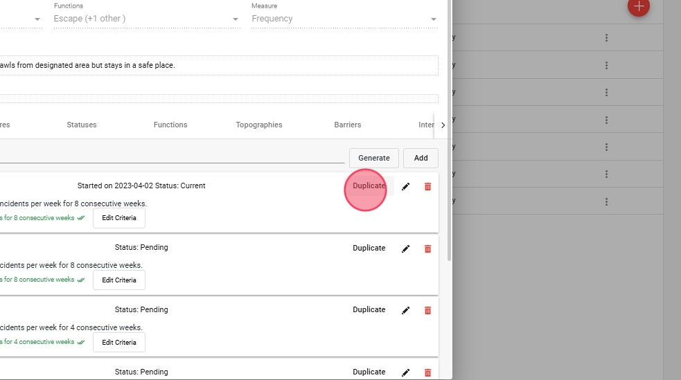 - Para los comportamientos, los usuarios pueden ajustar campos como Nombre, Estado, Medición (por ejemplo, Frecuencia, Porcentaje, Tiempo), Topografía y Barreras.
