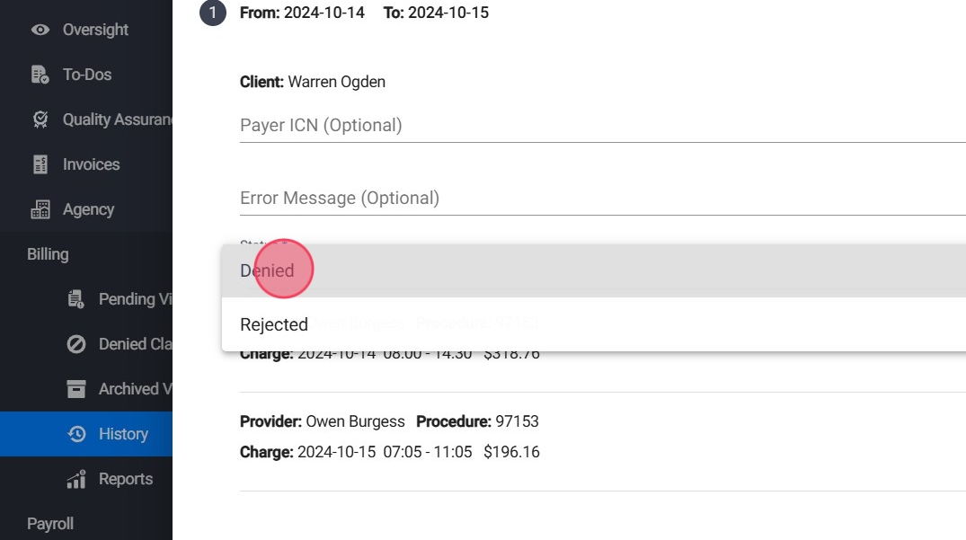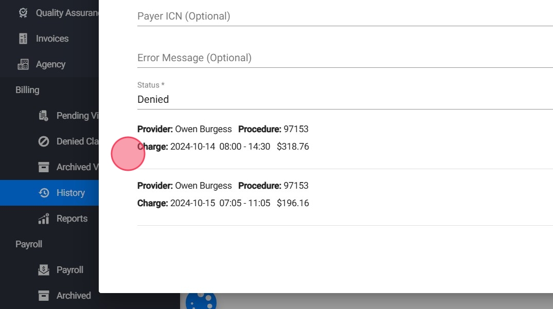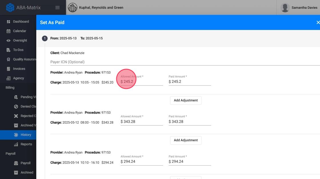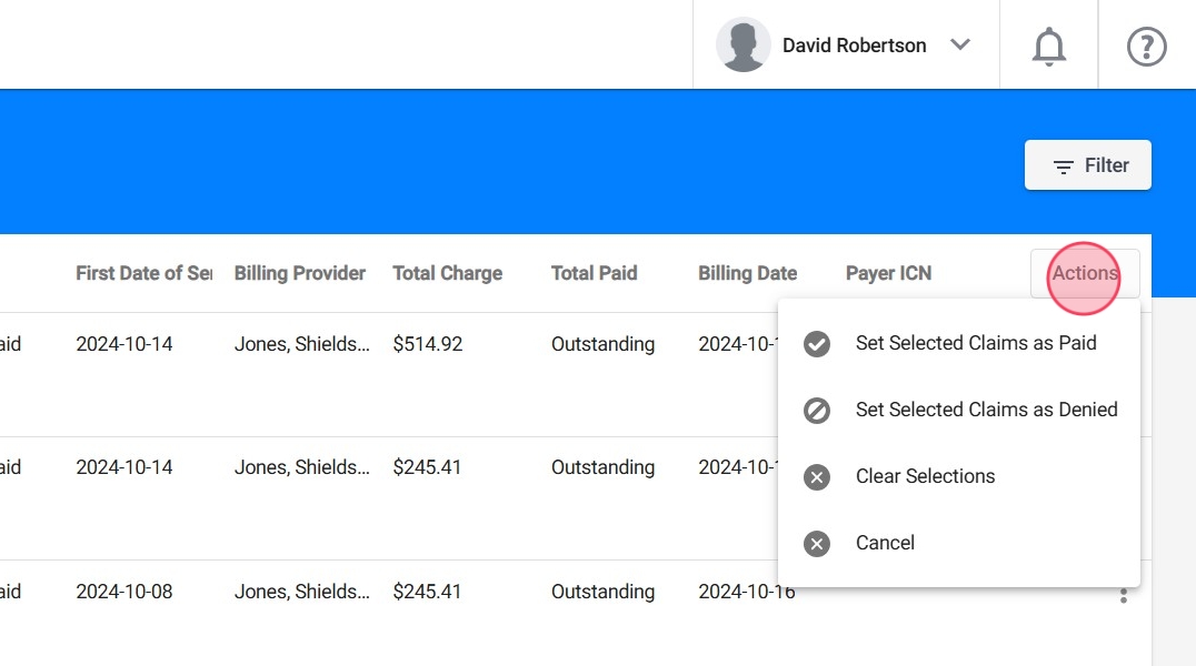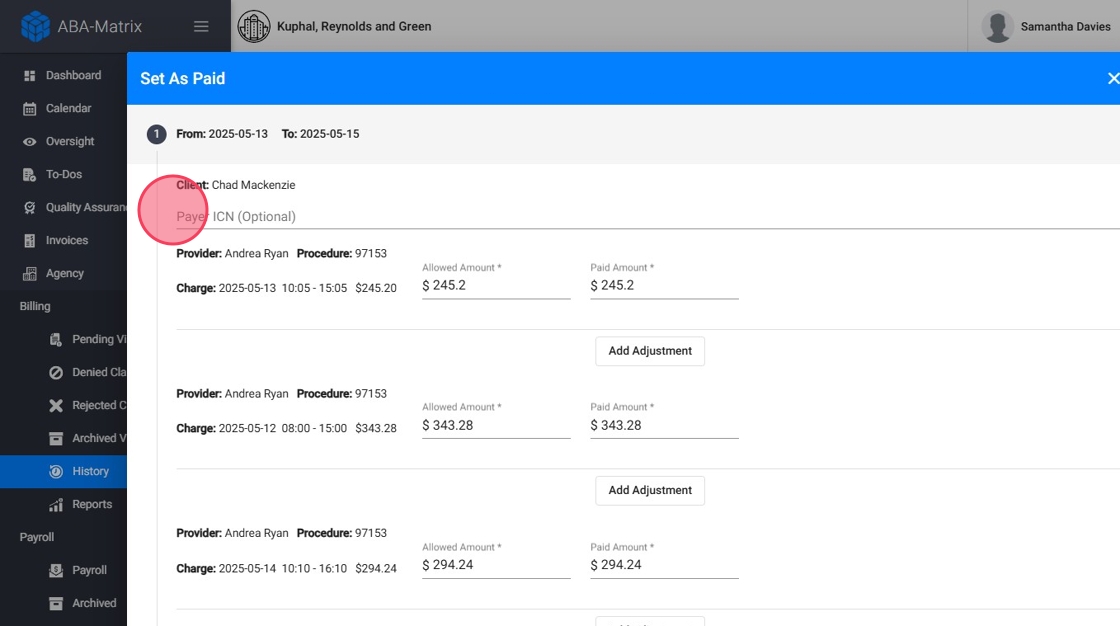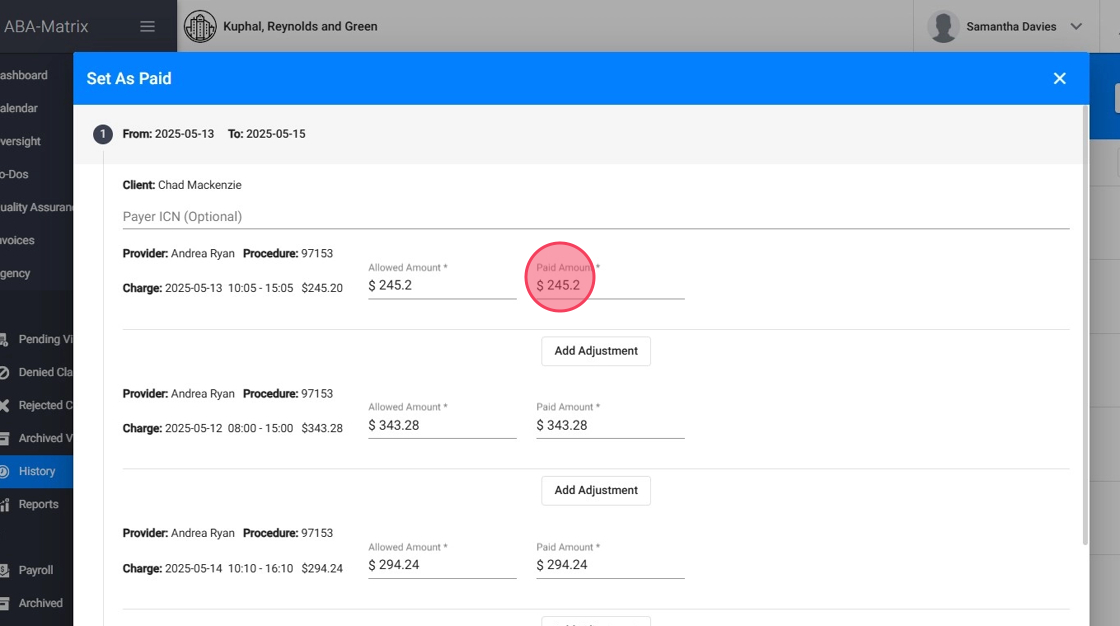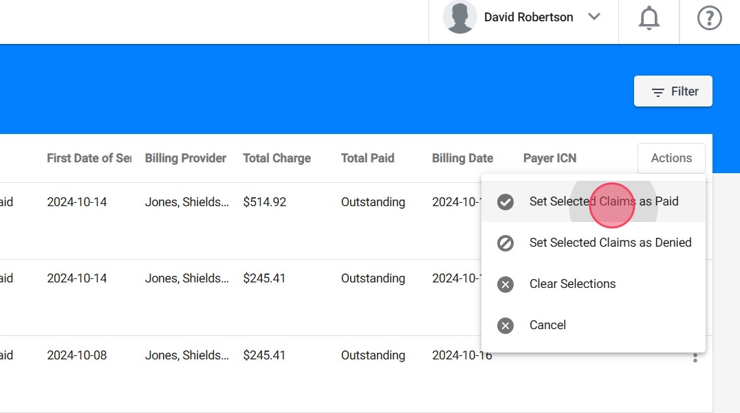 Después de seleccionar Set as Paid, verás los claims seleccionados junto con los cargos asociados.