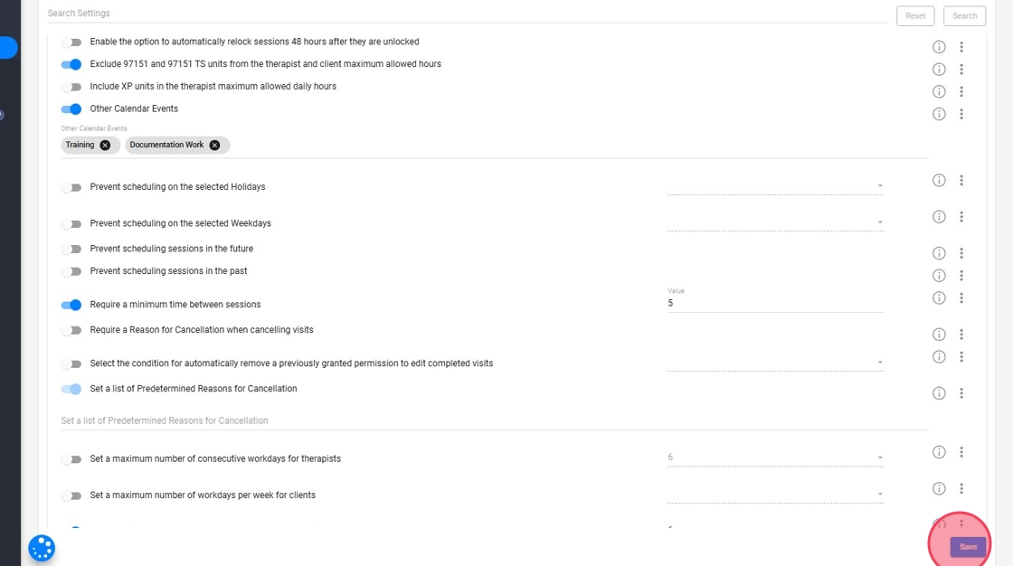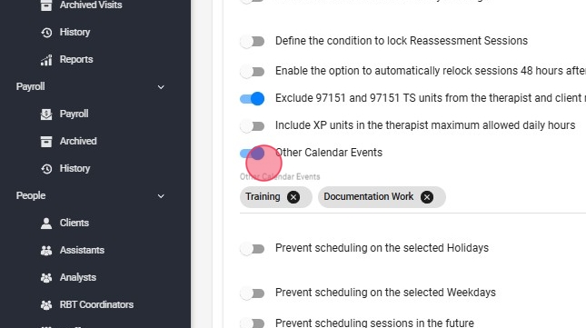 - Use this setting to specify which types of custom events your therapists are permitted to create (Training and Documentation Work in the image)