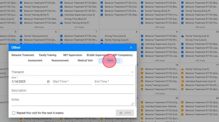 This guide is essential for agency staff seeking to efficiently manage and schedule "Other" events within their calendar system. In ABA Matrix, you can create the following events: Behavior Treatment Session, Family Training, Supervision, RBT Competency Check, Assessment, Reassessment, and Medical Visit. The "Other" events feature is fully customizable, enabling you to schedule therapist-only custom events, such as Trainings and Documentation Work, and seamlessly send them to payroll