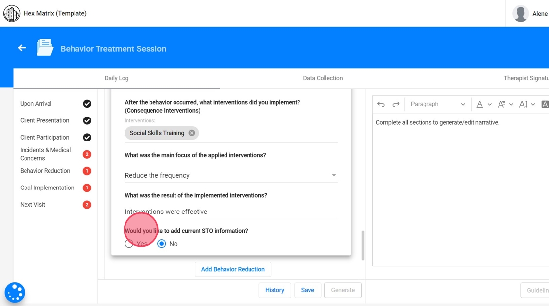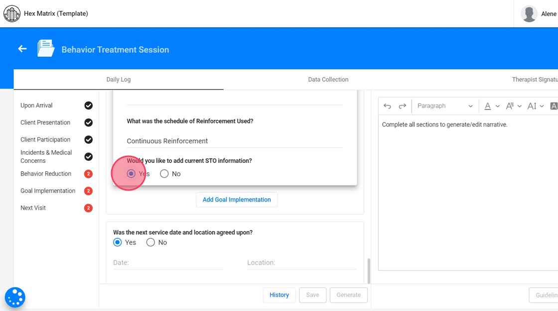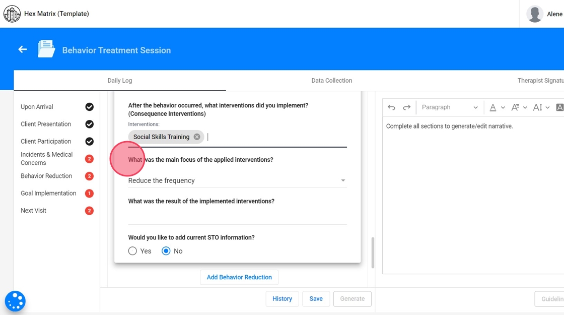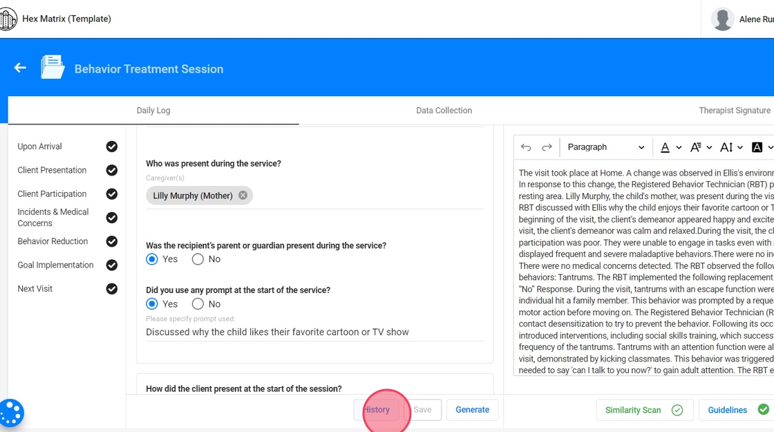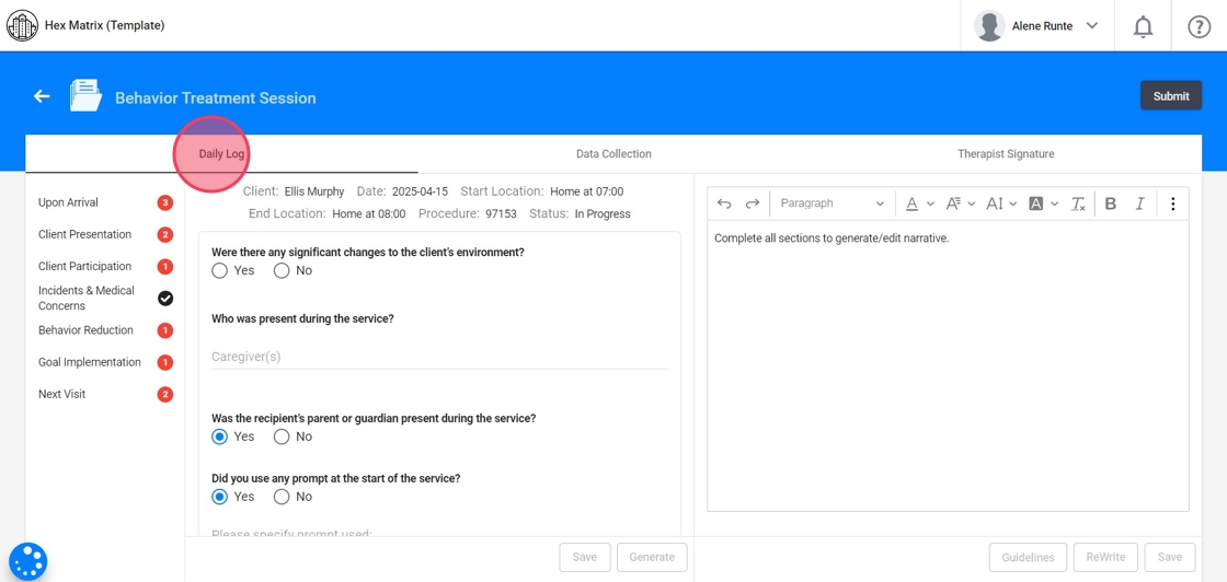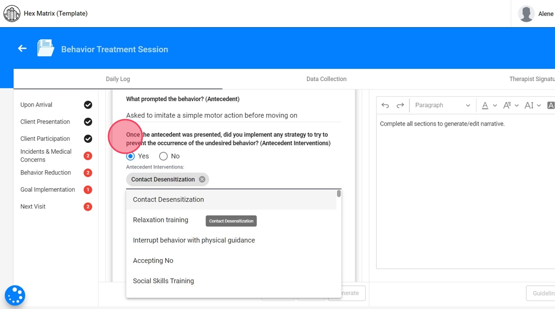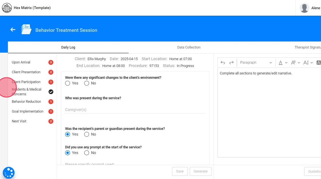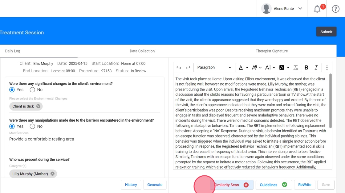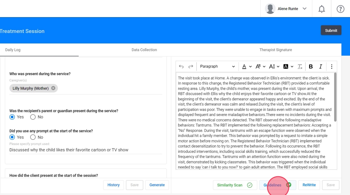Esta guía es fundamental para los RBTs que documentan sesiones de behavior treatment, ya que ofrece un formato estructurado que facilita el registro completo y preciso de la información. Incluye secciones organizadas, indicaciones útiles, alertas por campos incompletos y generación automática de narrativas. Al utilizar esta guía, los RBTs pueden mejorar la calidad de su documentación y, en última instancia, apoyar mejores resultados para los clientes.