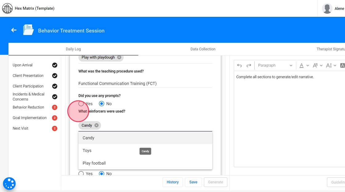 27. - What reinforcers were used? You will see a list of reinforcers pulled from the client’s Preferences section. Select the reinforcer(s) that were used to support goal implementation
