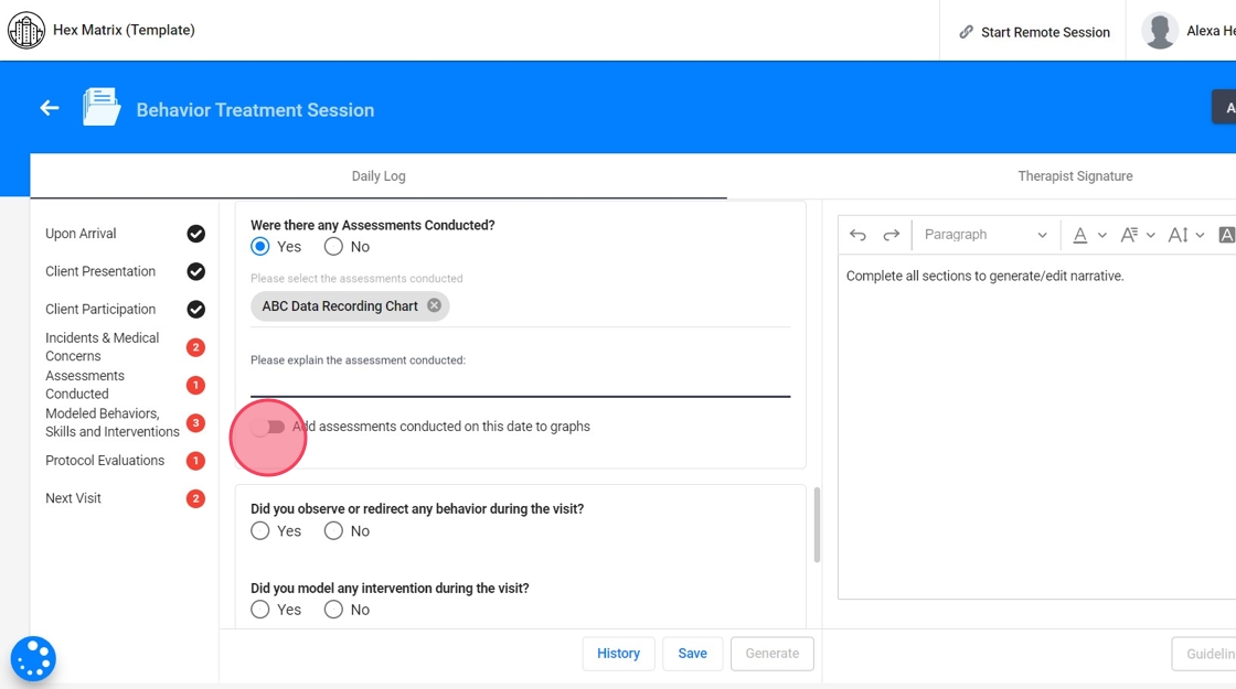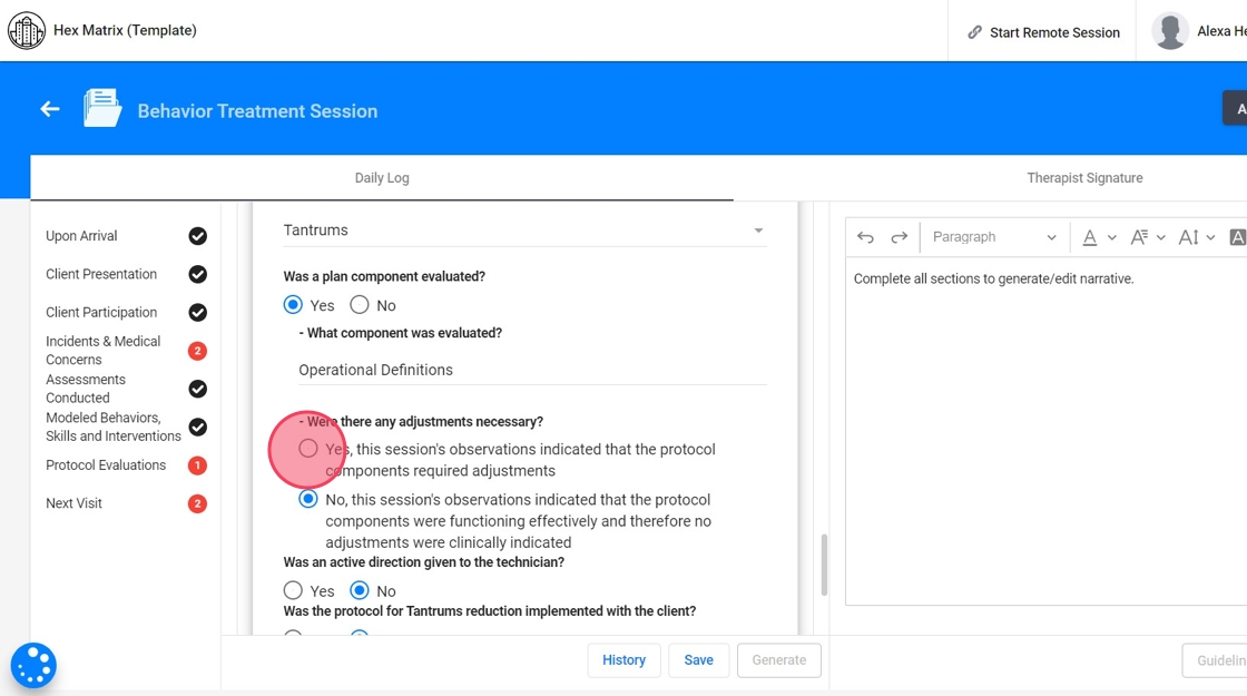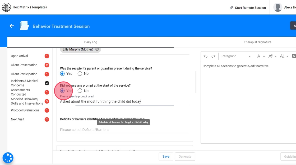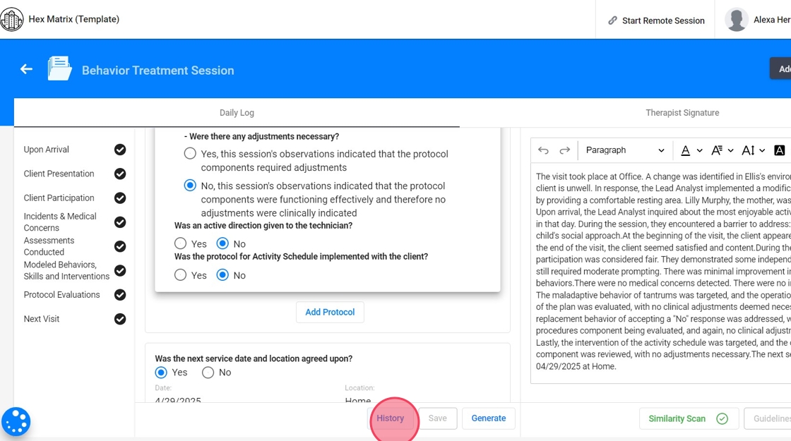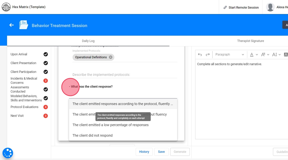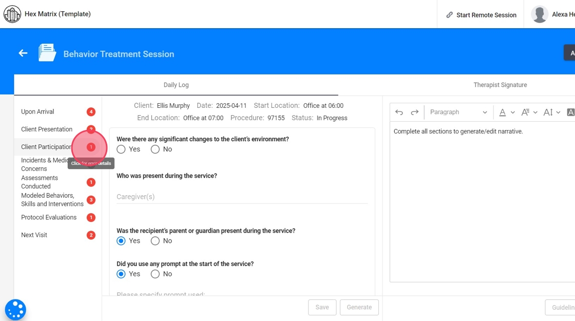 ABA Matrix offers a structured and efficient way to document client session details. The session note is divided into two main sections to support a comprehensive and organized workflow: