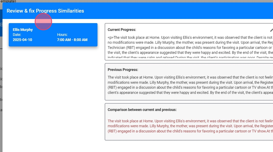 - The system compares the content of your current note with previous entries, checking for similarity based on the percentage allowed by the agency.