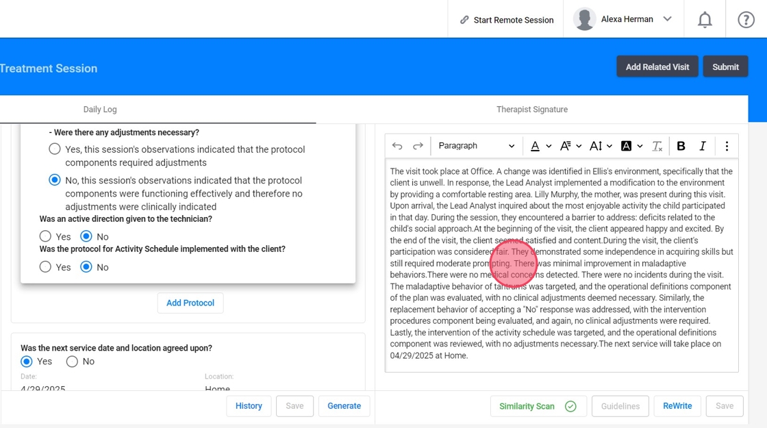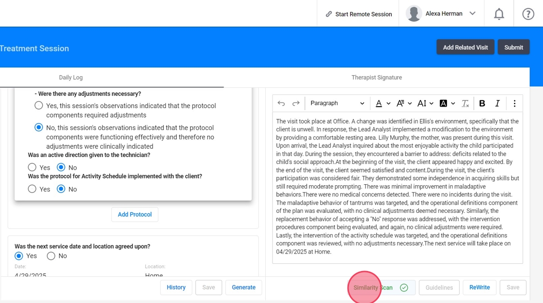 After the RBT generates the progress note, artificial intelligence will automatically analyze the content to determine whether it meets the established guidelines. The system includes predefined criteria to ensure each note meets the required standards, promoting clear, accurate documentation aligned with best clinical practices.