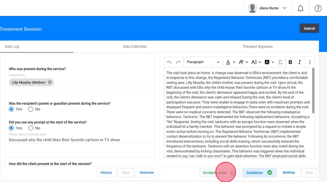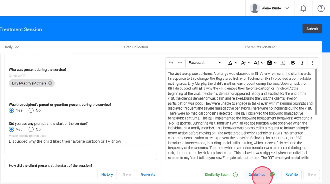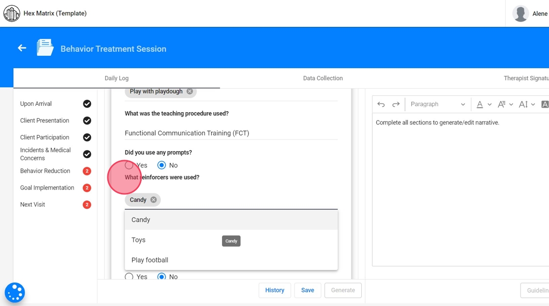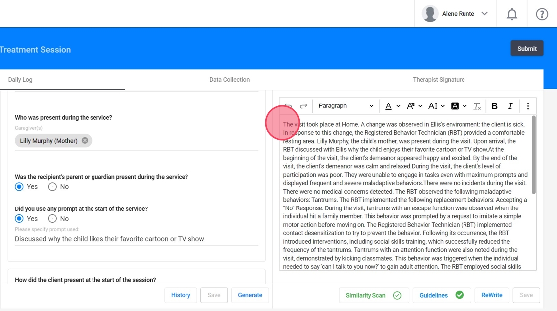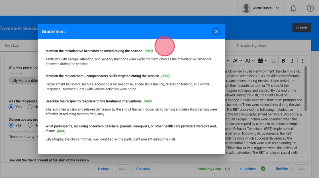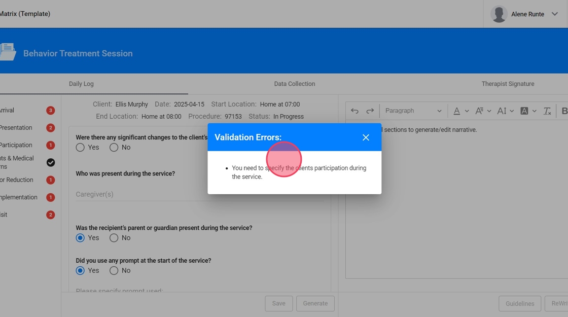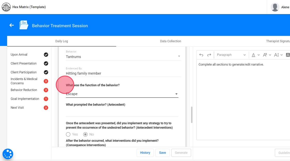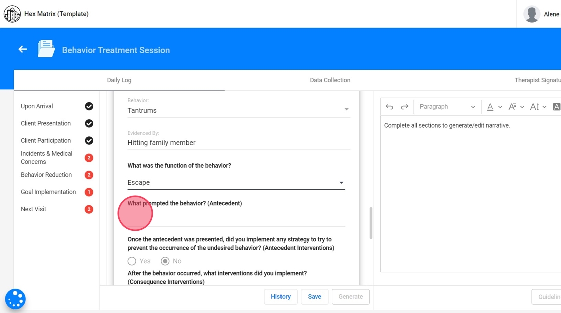 ABA Matrix ofrece una forma estructurada y eficiente de documentar los detalles de las sesiones con los clientes. La nota de sesión está dividida en tres secciones principales para apoyar un flujo de trabajo completo y organizado: