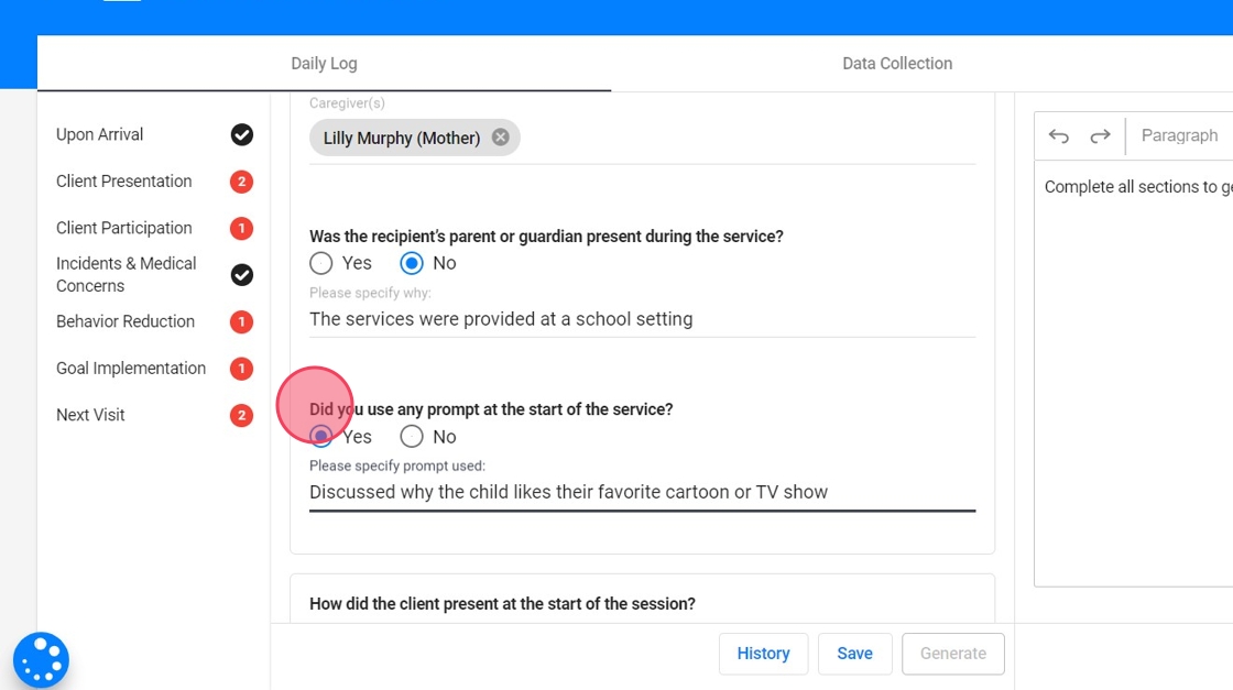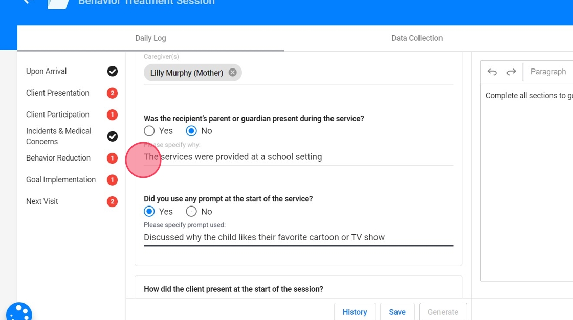 76. Después de completar las secciones de la nota, haga clic en “Generate” para que el sistema compile automáticamente sus entradas en una narrativa de progreso. La inteligencia artificial utilizará sus respuestas y selecciones para crear un borrador coherente, que luego podrá revisar, editar y finalizar para asegurarse de que refleje con precisión la sesión.