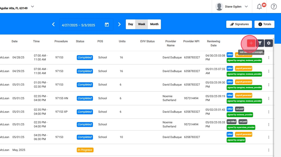 While viewing a specific client’s Oversight, click the red plus (+) icon to create a visit directly from the client’s profile, no need to switch to the calendar or global view.