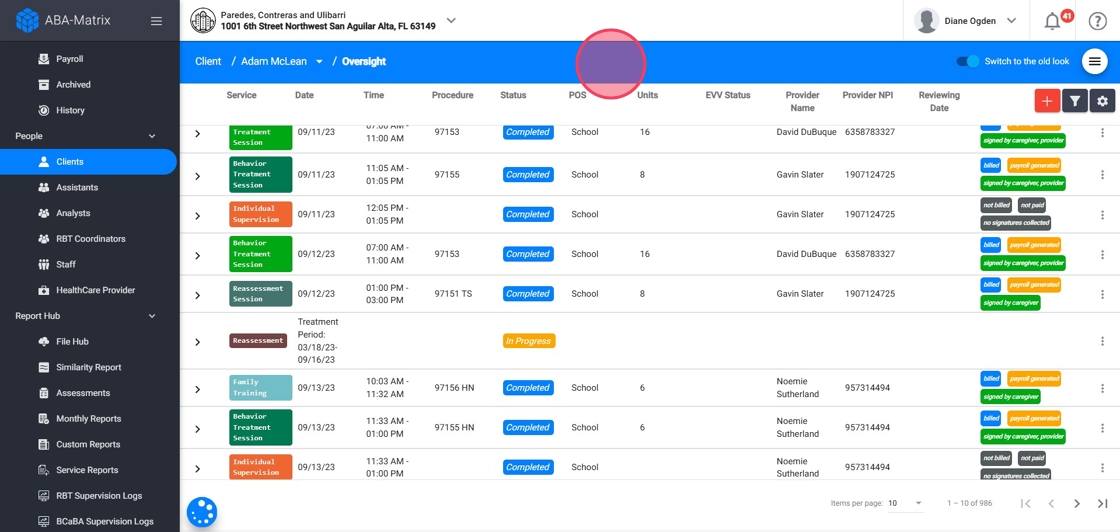 - Service Type – Filter by services such as Behavior Treatment, Supervision, Assessments, Monthly reports, etc.