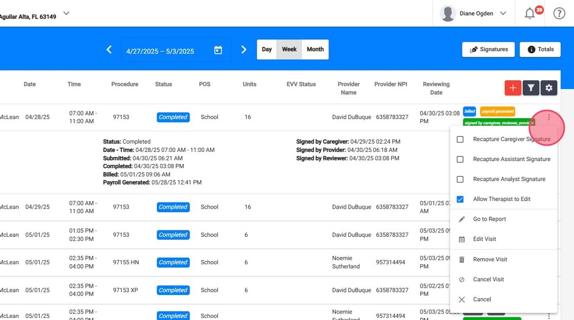 Click the arrow on a session row to reveal detailed information about the visit, including key data such as the Client, Provider, Procedure, Duration, Location, Status, and the Date and Time of service. You'll also see important timeline fields like the Submitted Date, Completed Date, Billed Date, and Payroll Date, along with signature timestamps from the Caregiver, Provider, and Reviewer.