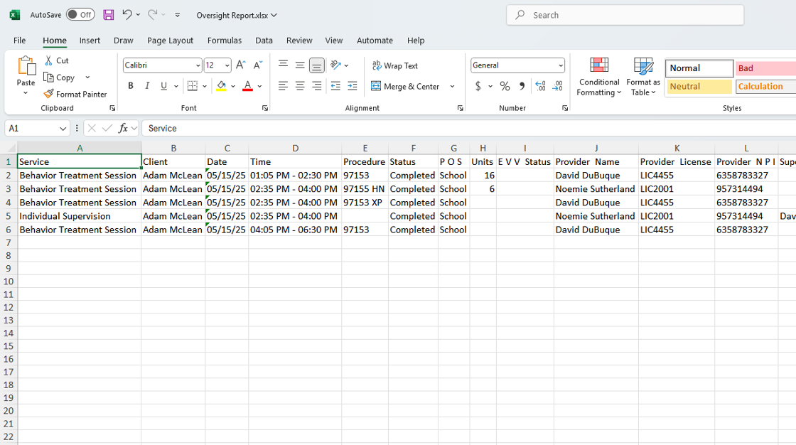 Client, Provider, Procedure, Duration, Location, Status, Date & Time, Submitted Date, Completed Date, Billed Date, Payroll Date, and all signature dates.