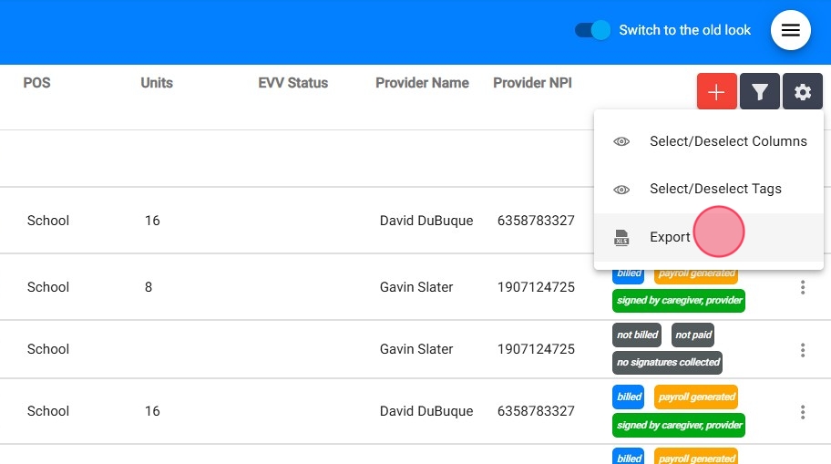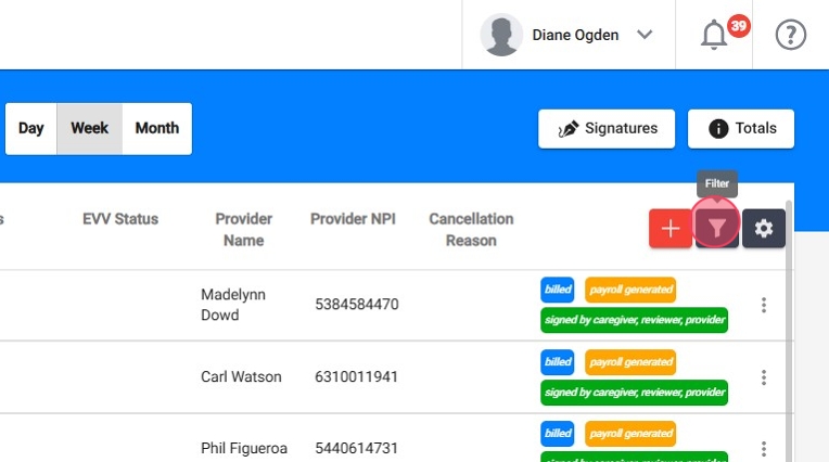 - Elija qué columnas desea mostrar u ocultar (Estado, EVV, Fechas, Información del Proveedor, etc.).