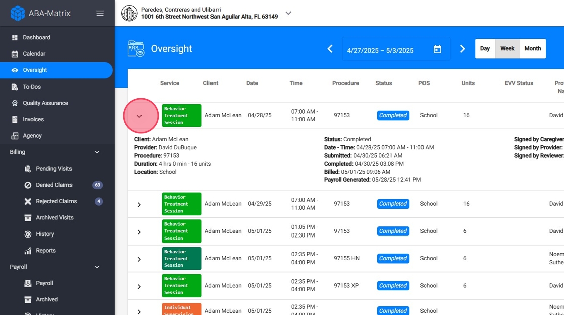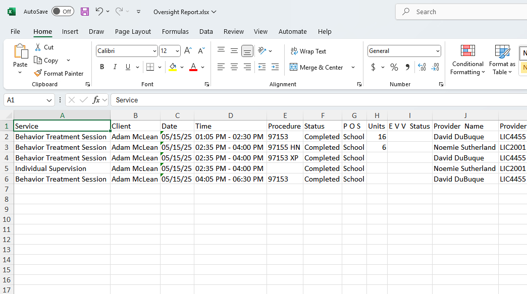 - Service Type – Filtre por servicios como Tratamiento Conductual, Supervisión, Evaluaciones, Informes Mensuales, etc.