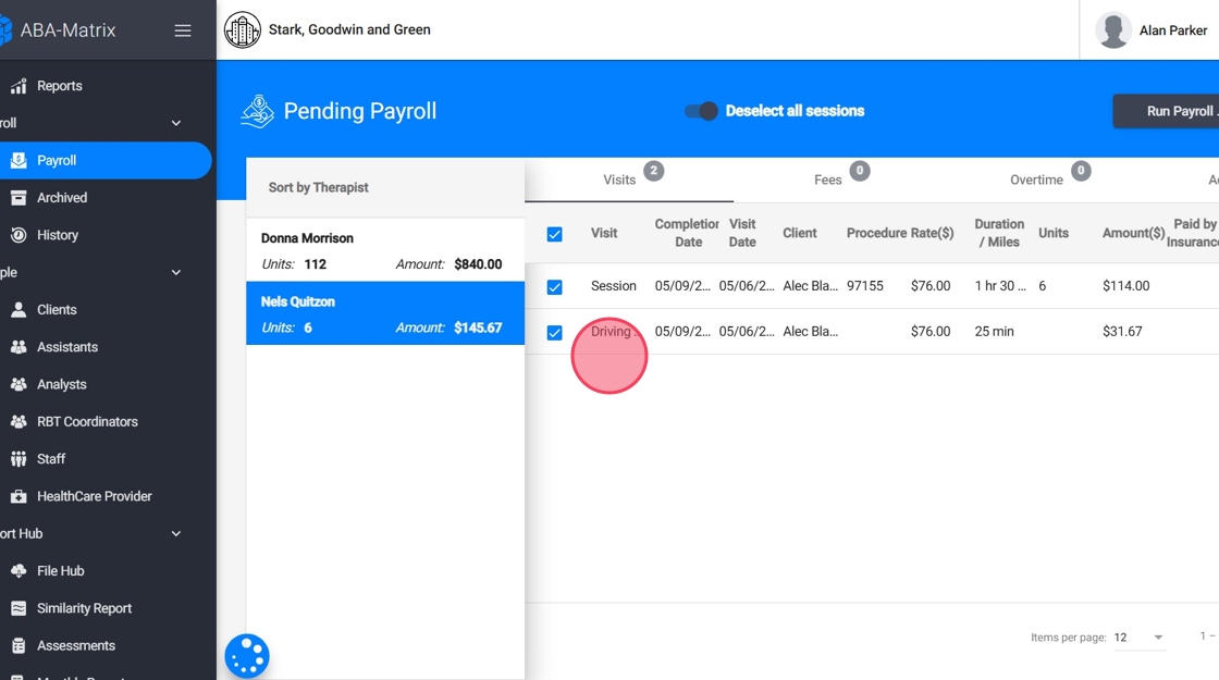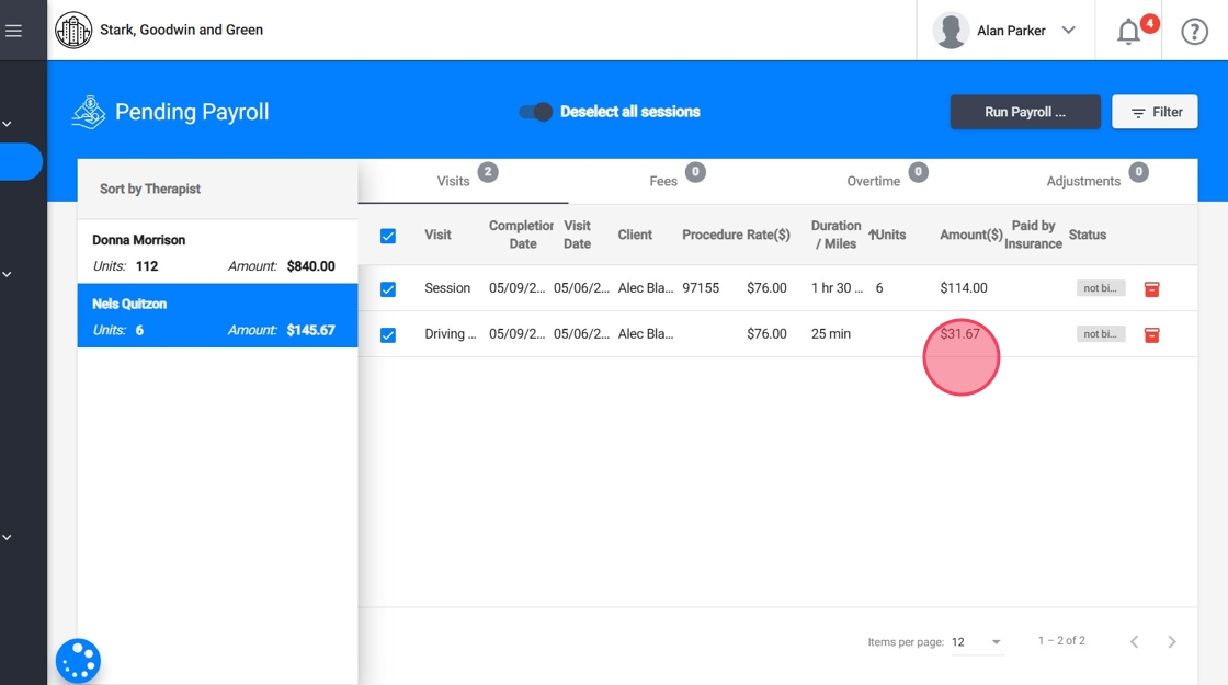 25. - Si una sesión aún no ha sido billeada, su Tiempo de Conducción asociado no aparecerá a menos que desmarques la opción "Show only billed sessions” en el filtro del Payroll