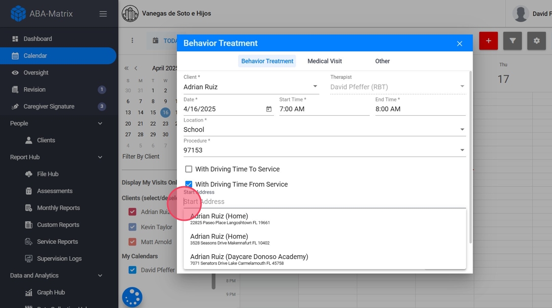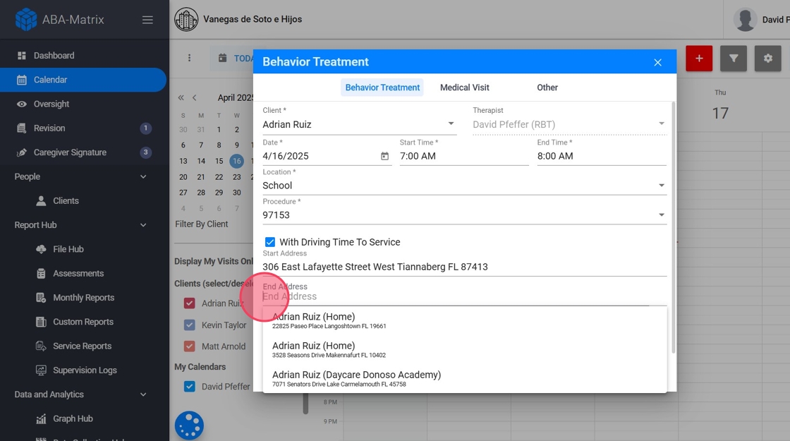 La dirección de destino mostrará automáticamente la dirección del cliente para quien se está programando la sesión.