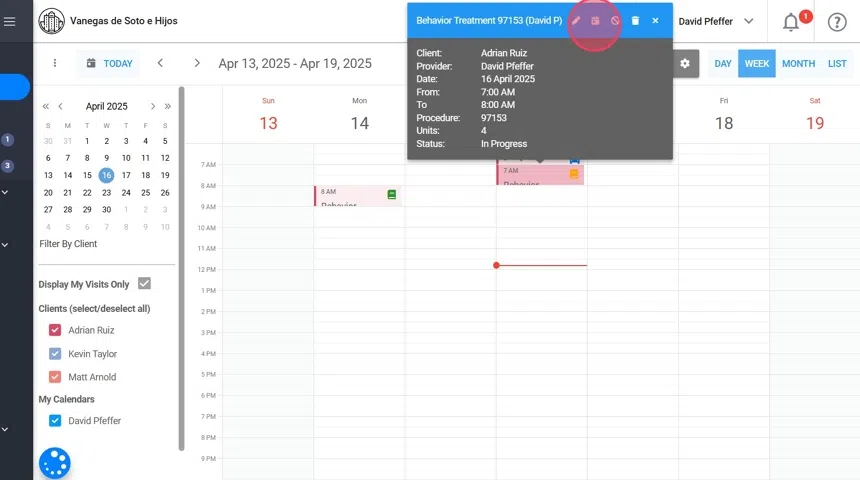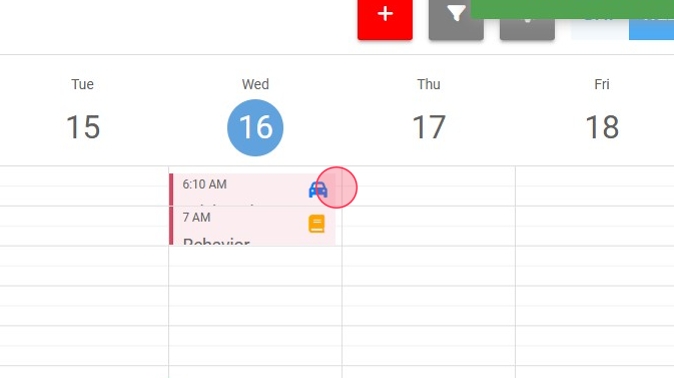 12. El tiempo de conducción hacia el servicio aparecerá en el Calendario como un evento antes de la sesión, marcado automáticamente como completado. La sesión programada seguirá inmediatamente después, comenzando a la hora que seleccionaste.
