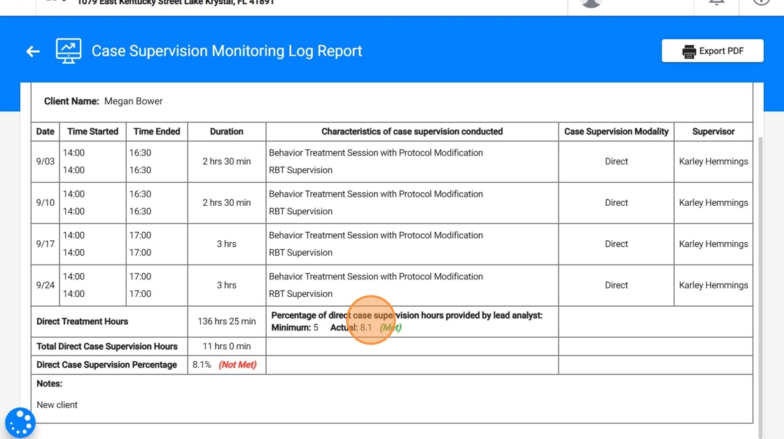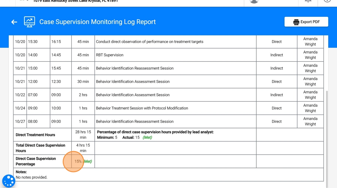 The system automatically calculates the Direct Case supervision percentage based on completed direct case supervision hours and treatment hours during the month.
