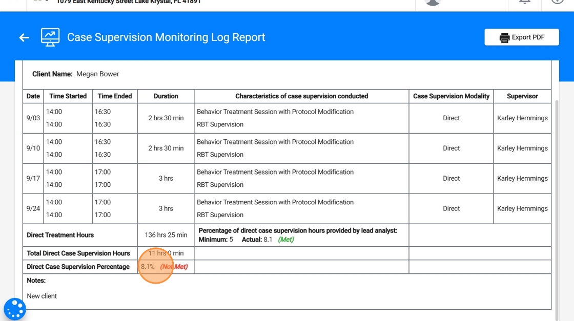 Example: If a client received 40 hours of direct treatment and 4 hours of direct case supervision, DSP = (4 ÷ 40) × 100 = 10%. The calculated DSP appears automatically within the log.