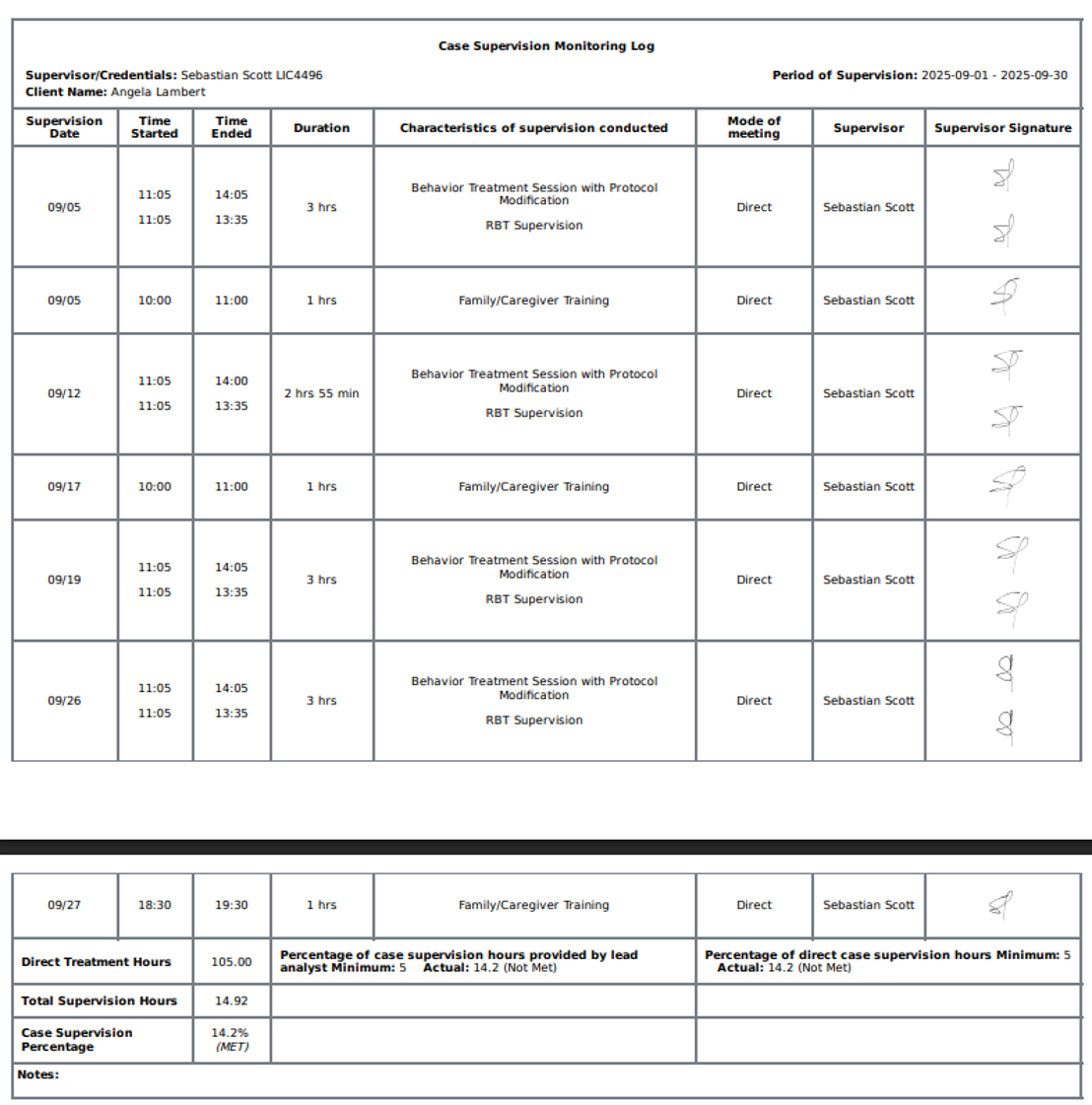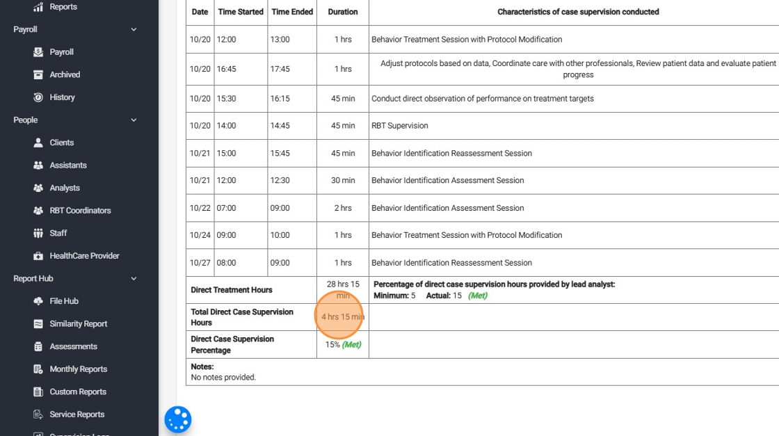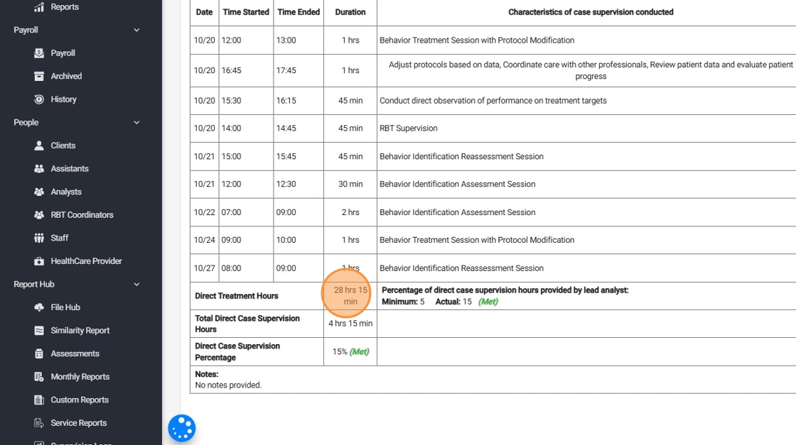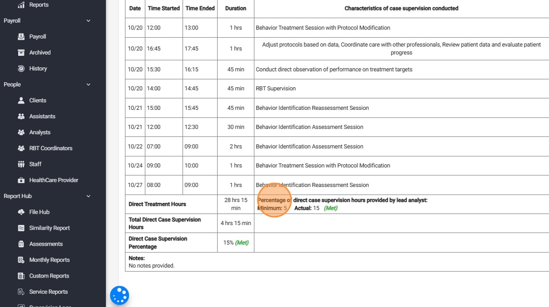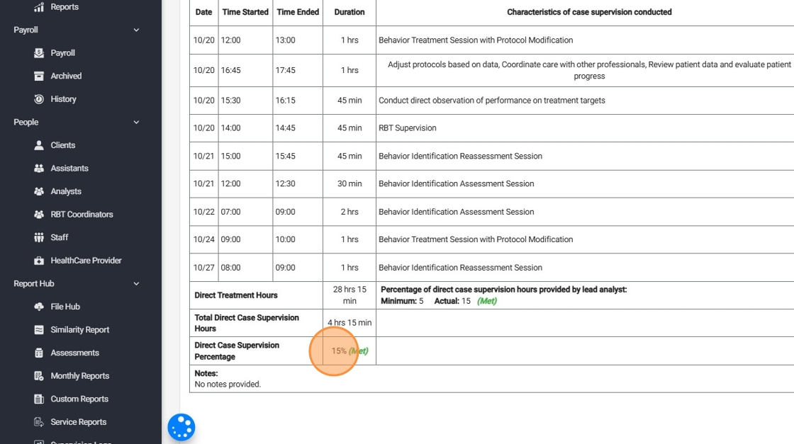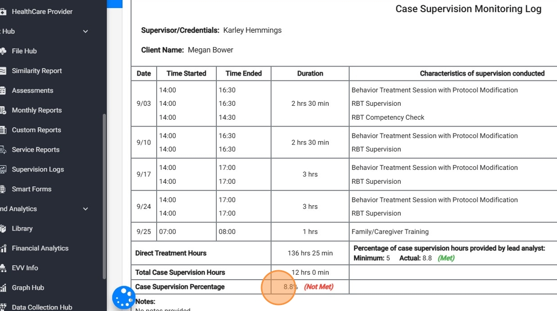 El porcentaje de supervisión de casos directa se calcula de forma automática en función de las horas de supervisión directa completadas y las horas de tratamiento directo durante el mes.