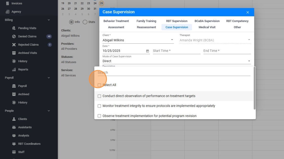 - Eventos de Supervisión de Casos Directa: El sistema incluye automáticamente todas las actividades calificadas de supervisión de casos directa programadas durante el mes, tales como: