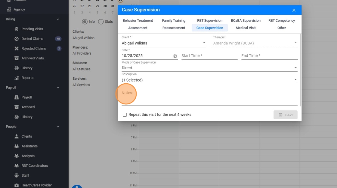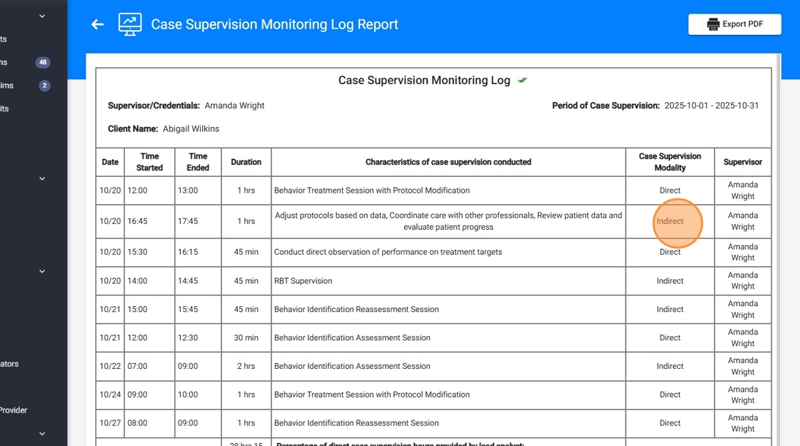 6. - Eventos de Supervisión de Casos Indirectos: Las horas de supervisión indirecta también aparecerán una vez que se programen en el calendario (por ejemplo, análisis de datos, documentación).