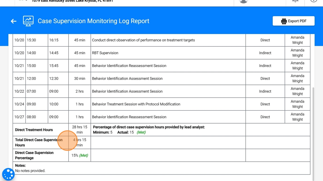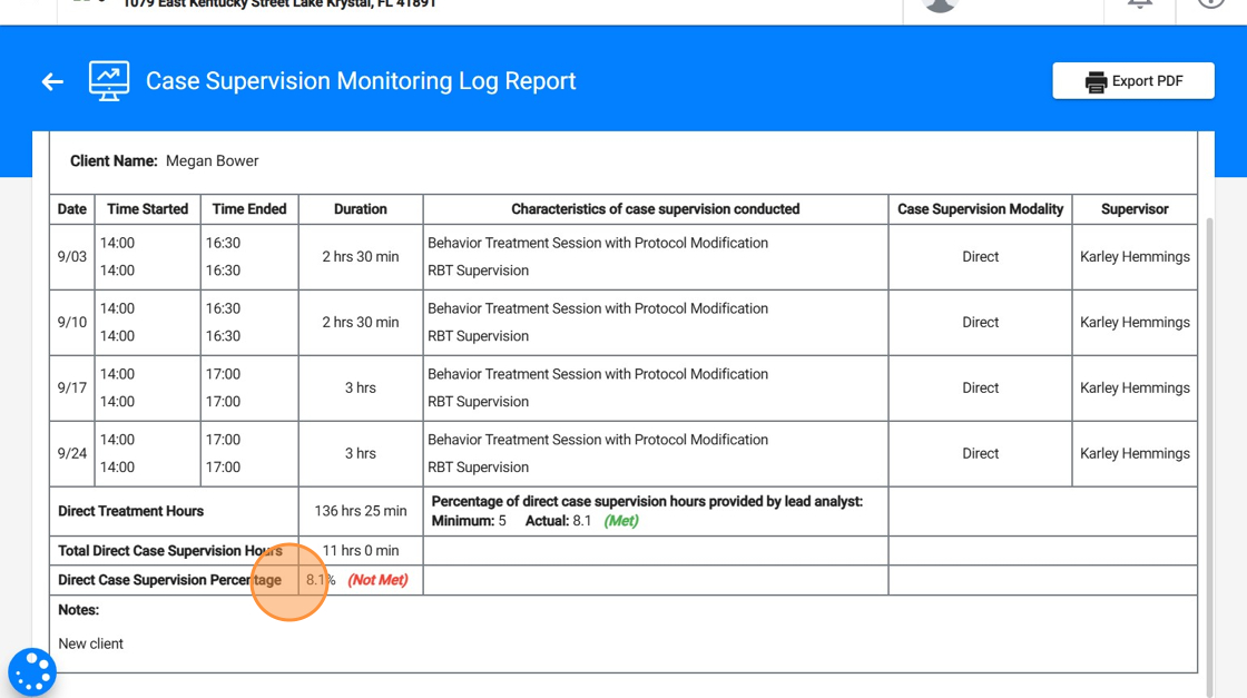 El sistema calcula de forma automática el porcentaje de supervisión de casos directos en función de las horas de supervisión directa completadas y las horas de tratamiento directo durante el mes.