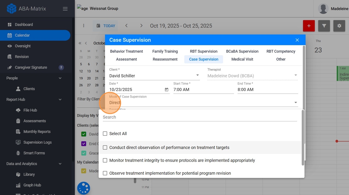 Las horas de supervisión indirecta también aparecerán una vez que se programen en el calendario (por ejemplo, análisis de datos, documentación).