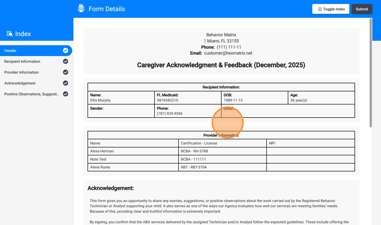 This guide provides essential information for caregivers on how to access and complete the Acknowledgment & Feedback Report, ensuring their feedback on ABA services is effectively communicated. It outlines secure methods for accessing the form, either through email or in-person with agency staff, while protecting client information. Caregivers will find a user-friendly process for submitting their observations and concerns, which directly contributes to service evaluation and quality improvement. Viewing this guide empowers caregivers to share their valuable insights efficiently.