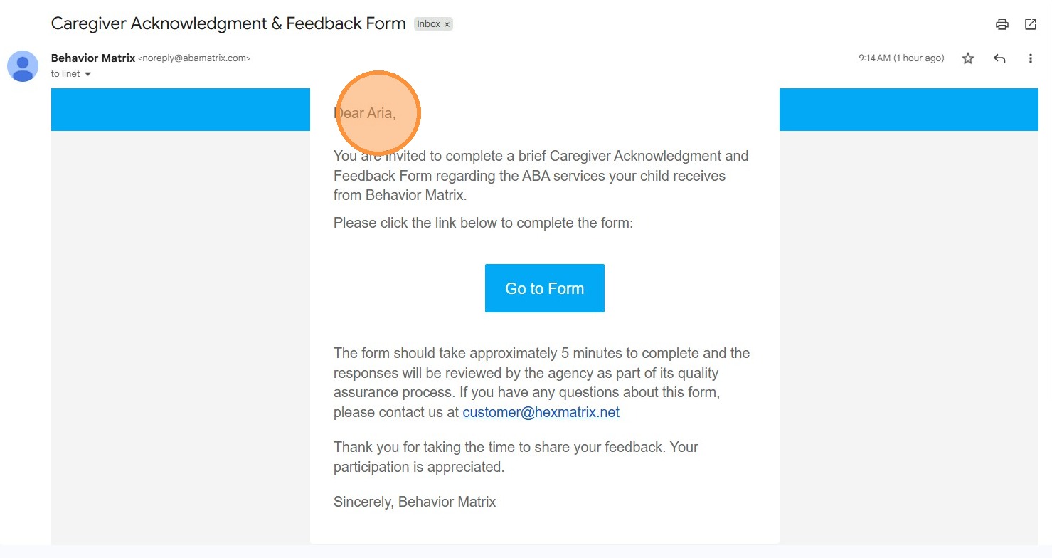 1. Los cuidadores pueden recibir una invitación por correo electrónico informándoles que han sido invitados a completar una breve encuesta sobre los servicios de ABA que su hijo recibe de la agencia. El correo explica el propósito de la encuesta, que es recopilar comentarios para apoyar la evaluación del servicio y la mejora de la calidad, y señala que la encuesta tarda aproximadamente 5 minutos en completarse.