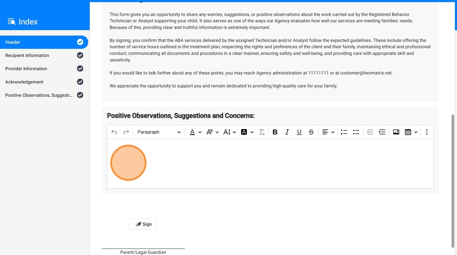 7. El cuidador puede firmar directamente dentro del formulario al final del informe. Para firmar, el cuidador hace clic en Sign, ingresa o selecciona el nombre en Signed By y luego hace clic en Approve para completar la firma.