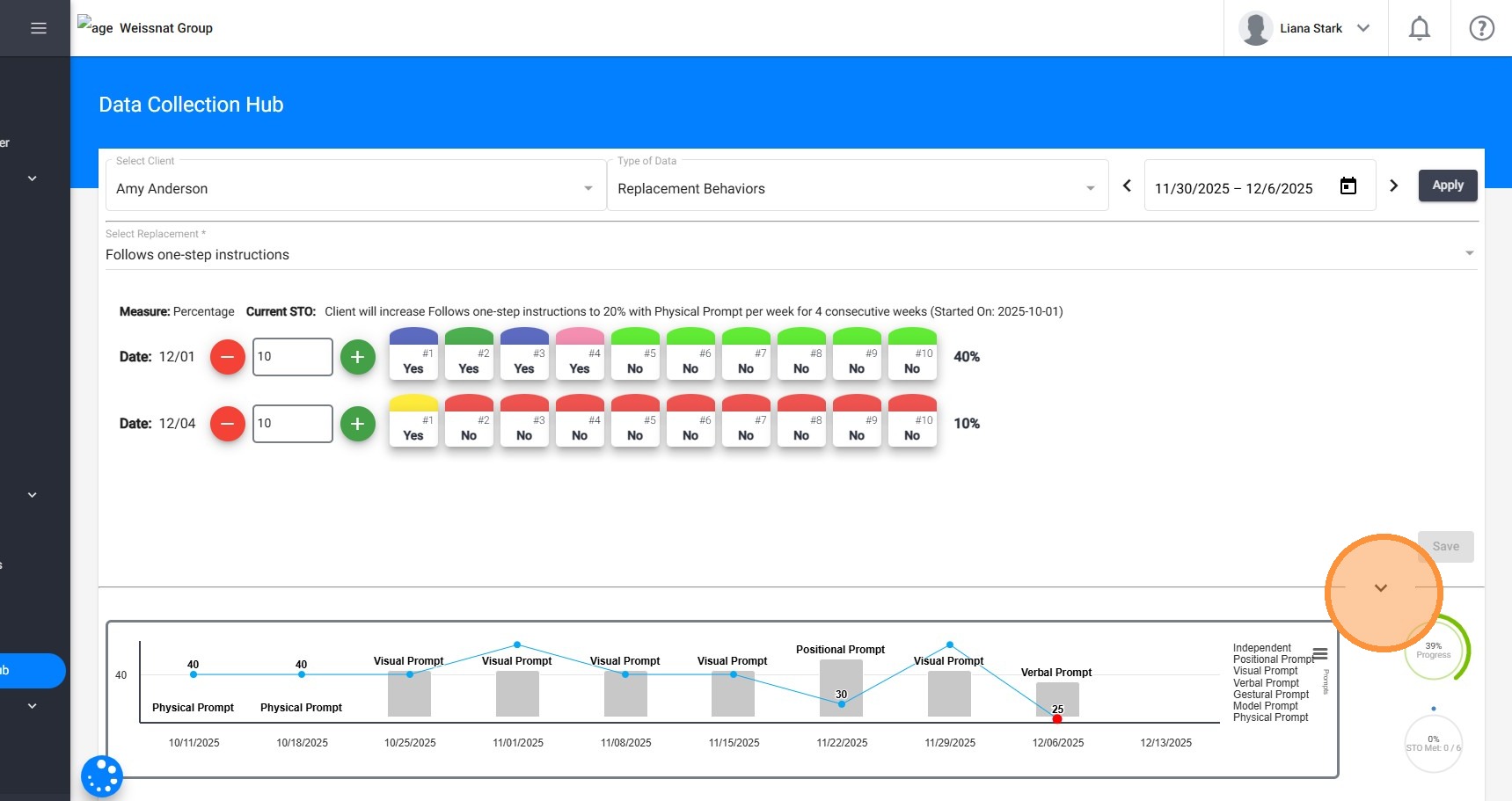 5. A medida que registre datos de prompts, el gráfico de recolección de datos en tiempo real se actualizará automáticamente para reflejar el uso de prompts, ofreciéndole retroalimentación visual inmediata sobre los niveles de independencia y el apoyo proporcionado.