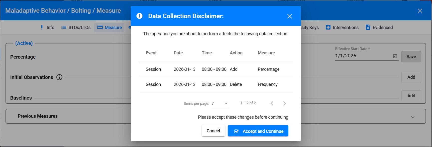 If the new effective start date falls within a period where data was previously recorded using a different measure, a pop-up window will appear informing you that data from those sessions recorded with the previous measure will be deleted and replaced by the new one. If the previous and new measures are not compatible, the existing data will be lost.