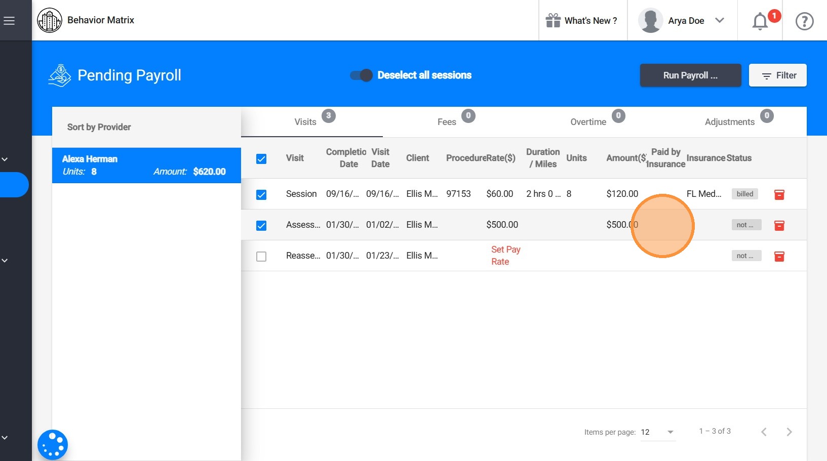 9. La columna Paid by Insurance (Pagado por el Seguro) muestra el monto total pagado por todas las sesiones de observación vinculadas al reporte de evaluación o reevaluación.